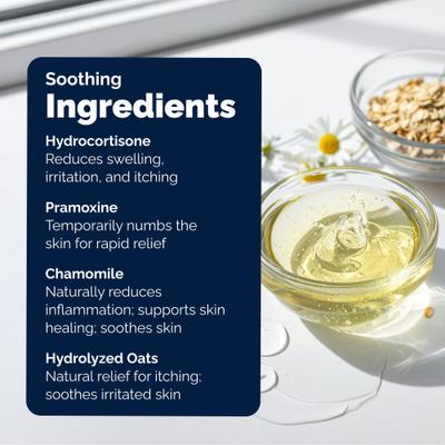 - El 0,5 % de pramoxina ayuda a adormecer la picazón, mientras que el extracto de avena ayuda a calmar e hidratar la piel.