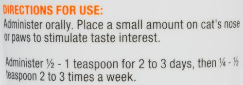 Place a small amount of Laxat1 on the animal’s nose or paws to stimulate taste interest. Administer 1/2 - 1 teaspoon daily for 2 - 3 days, then 1/4 - 1/2 teaspoon 2 - 3 times a week. Store in a cool, dry place.