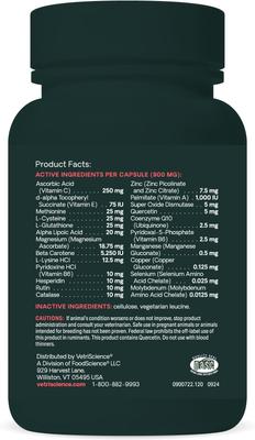 Active Ingredients: Ascorbic Acid (Vitamin C), D-Alpha Tocopheryl Succinate (Vitamin E), Methioine (Enteric Coated), L-Cysteine (Enteric Coated), L-Glutathione (Enteric Coated), Alpha Lipoic Acid, Magnesium (as Magnesium Ascorbate), Beta Carotene, L-Lysine Hci, Pyridoxine HCl (Vitamin B6), Hesperidin, Rutin, Catalase (Enteric Coated), Zinc (as Zinc Picolinate and Zinc Citrate), Palmitate (Vitamin A), Super Oxide Dismutase (Enteric Coated), Quercetin, Coenzyme Q10 (Ubiquinone), Pyridoxal-5-Phosphate (Vitamin B6), Manganese (as Manganese Gluconate), Copper (as Copper Gluconate), Selenium (as Selenium Amino Acid Chelate), Molybdenum (as Molybdenum Amino Acid Chelate).