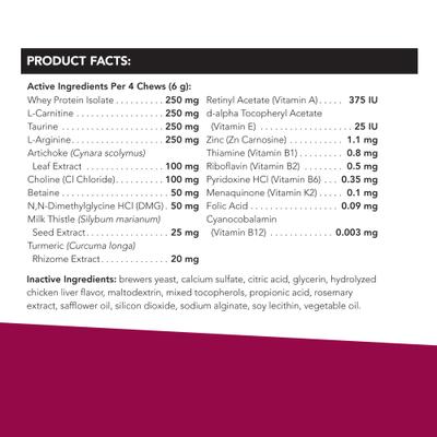 Active Ingredients: (Per 4 Chews) Gluta-Syn® Whey Protein Isolate 250 mg, L-Carnitine 250 mg, Taurine 250 mg, L-Arginine 250 mg, Artichoke (Whole Herb) 100 mg, Choline (Choline Chloride) 100 mg, Betaine 50 mg, N,N-Dimethylglycine (D mg), HCl 50 mg, Milk Thistle Extract 25 mg, Turmeric Extract 20 mg, Retinyl Acetate (Vitamin A) 375 IU d-alpha Tocopheryl Acetate (Vitamin E) 25 IU Zinc (Zn Carnosine) 1.1 mg, Thiamine (Vitamin B1) 0.8 mg, Riboflavin (Vitamin B2) 0.5 mg, Pyridoxine HCl (Vitamin B6) 0.35 mg, Menaquinone (Vitamin K2) 0.1 mg, Folic Acid 0.09 mg, Cyanocobalamin (Vitamin B12) 0.003 mg.