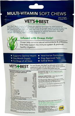Give your doggie dude his daily dose of vitamins with Vet's Best Multi-Vitamin Soft Chew Dog Supplement. These multi-vitamin chews for dogs are veterinarian formulated with a key blend of essential vitamins, minerals and nutrients. They include ocean kelp, antioxidants, prebiotics, vitamin B complex, vitamin A, vitamin D, selenium and zinc that are optimized for bioavailability. These extra-moist multi-vitamin chews are designed to help reduce stress and promote a healthy immune and digestive system. They are the paw-fect once-a-day way to support your furry friend’s physical and mental well-being.