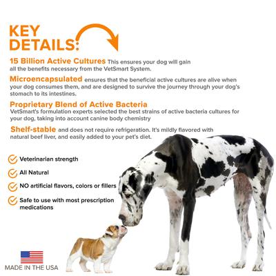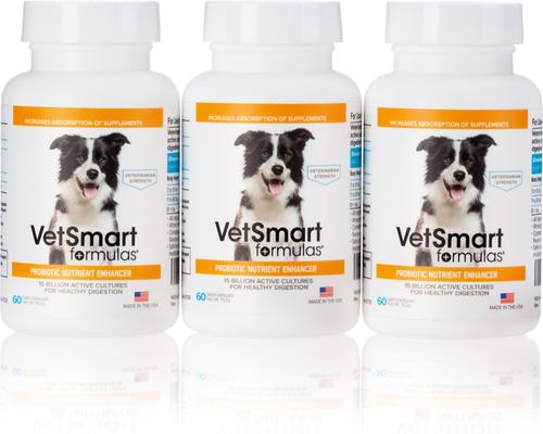 As a dog parent, you surely give your canine companion food she loves. With VetSmart Formulas Probiotic Nutrient Enhancer Dog Supplement, you can help give her meals a boost by providing a boost to her gut health. Formulated with live, active cultures, VetSmart Formulas Probiotic Nutrient Enhancer Dog Supplement works to promote gut stability by replacing acids needed for digestion and providing the good bacteria that is needed for a healthy digestive system. By also working to reduce inflammation and restore nutritional balance that may be blocked by food additives, VetSmart Formulas Probiotic Nutrient Enhancer Dog Supplement can help do more than promote a happy gut—it can help promote an even happier, healthier dog.