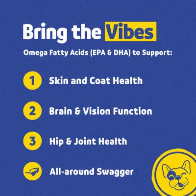 - Packed with a rich source of omega-3 fatty acids that includes EPA and DHA to nourish skin, support the immune system and overall wellness, plus keep their coat’s shine game strong. Oh, and it works overtime to support their brain and vision function, as well as hip and joint health.