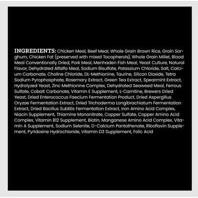 Harina de pollo, harina de res, arroz integral, sorgo, grasa de pollo (conservada con tocoferoles mixtos), mijo integral, harina de sangre desecada convencionalmente, harina de cerdo, harina de pescado lacha, cultivo de levadura, saborizante natural, harina de alfalfa deshidratada, bisulfato de sodio, cloruro de potasio, sal, carbonato de calcio, cloruro de colina, DL-metionina, taurina, dióxido de silicio, pirofosfato tetrasódico, extracto de romero, extracto de té verde, extracto de hierbabuena, levadura hidrolizada, complejo de zinc-metionina, harina de algas deshidratadas, sulfato ferroso, carbonato de cobalto, suplemento de vitamina E, L-carnitina, levadura de cerveza deshidratada, producto de fermentación de Enterococcus faecium deshidratado, Aspergillus deshidratado Extracto de fermentación de Oryzae, extracto de fermentación de Trichoderma longibrachiatum seco, extracto de fermentación de Bacillus subtilis seco, complejo de aminoácidos de hierro, suplemento de niacina, mononitrato de tiamina, sulfato de cobre, complejo de aminoácidos de cobre, suplemento de vitamina B12, biotina, complejo de aminoácidos de manganeso, suplemento de vitamina A, selenito de sodio, pantotenato de calcio D, suplemento de riboflavina, clorhidrato de piridoxina, suplemento de vitamina D3, ácido fólico