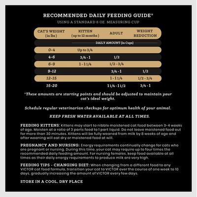 Es mejor hacer una transición de una marca de alimento para gatos a otra en un período de una semana a 10 días. Reemplace gradualmente su alimento actual con la fórmula Victor, aumentando el porcentaje de la mezcla al 100 % en un plazo de 7 a 10 días.