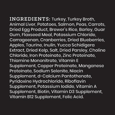 Turkey, Turkey Broth, Animal Liver, Potatoes, Salmon, Peas, Carrots, Dried Egg Product, Brewer’s Rice, Barley, Guar Gum, Flaxseed Meal, Potassium Chloride, Carrageenan, Cranberries, Dried Blueberries, Apples, Taurine, Inulin, Yucca Schidigera Extract, Dried Kelp, Salt, Dried Parsley, Choline Chloride, Iron Proteinate, Zinc Proteinate, Thiamine Mononitrate, Vitamin E Supplement, Copper Proteinate, Manganese Proteinate, Sodium Selenite, Niacin Supplement, d-Calcium Pantothenate, Pyridoxine Hydrochloride, Riboflavin Supplement, Potassium Iodide, Vitamin A Supplement, Biotin, Vitamin D3 Supplement, Vitamin B12 Supplement, Folic Acid.