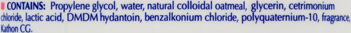 Propylene glycol, water, natural colloidal oatmeal, glycerin, cetrimonium chloride, lactic acid, DMDM hydantoin, benzalkonium chloride, polyquaternium-10, fragrance, Kathon CG.