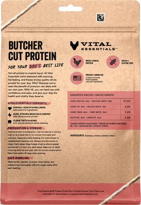 Looking for guilt-free treats to match your pet’s raw diet? Try Vital Essentials Chicken Breast Grain-Free Freeze-Dried Raw Dog Treats. These high-value rewards are packed with whole-animal, butcher-cut protein. Muscles, organs, and bones are full of naturally occurring vitamins and minerals to promote overall health. Vital Essentials pet treats aren’t just an indulgence—they help build strong muscles for more play, and they provide natural support for your dog’s digestive and oral health. Plus, they offer all the benefits of raw protein in a convenient, freeze-dried snack.