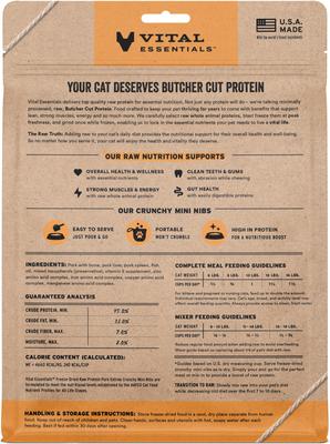 Thinking about feeding your pet a raw diet? Make the switch with Vital Essentials Freeze-Dried Raw Pork Entree & Mixer Cat Food Crunchy Nibs. This complete and balanced recipe is American made using premium, butcher-cut protein. Vital Essentials’ whole animal protein is responsibly sourced and humanely harvested for a meal pet parents can feel good about. Raw muscles and organs contain natural vitamins and minerals that help build strong muscles for more play. They also provide natural digestive and oral health support. Packed with essential nutrients, Crunchy Nibs offer everything your cat needs to look and feel their best. Plus, the freeze-dried formula makes it easy to serve a natural and nutritious raw diet.