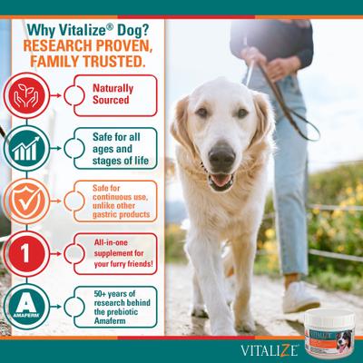 As a pet parent, you want your dog to have the very best, and with that comes a healthy digestive system. The Vitalize Dog Supplement supports the microbes of your dog’s gut to help promote digestive health and address stomach-related issues like diarrhea, scooting, and an upset stomach. You also want your dog to look and feel great on the outside, as well as the inside, which is why the Vitalize Dog Supplement also contains a blend of omega 6, omega 3 and biotin to promote healthy skin and a shiny coat for your canine companion.