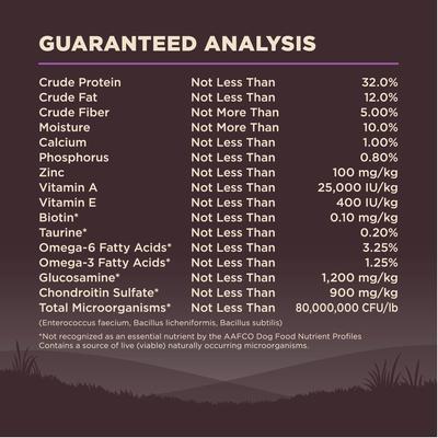 Deboned Turkey, Chicken Meal (source of Glucosamine and Chondroitin Sulfate), Lentils, Peas, Dried Ground Potatoes, Turkey Meal, Chickpeas, Dried Plain Beet Pulp, Flaxseed, Chicken Fat, Natural Flavor, Salmon Oil, Dried Chicory Root, Taurine, Vitamin E Supplement, Choline Chloride, Spinach, Broccoli, Carrots, Parsley, Apples, Blueberries, Kale, Mixed Tocopherols added to preserve freshness, Niacin, Zinc Proteinate, Ferrous Sulfate, Zinc Sulfate, Iron Proteinate, Vitamin A Supplement, Thiamine Mononitrate, d-Calcium Pantothenate, Sodium Selenite, Pyridoxine Hydrochloride, Copper Sulfate, Manganese Sulfate, Riboflavin, Manganese Proteinate, Copper Proteinate, Biotin, Vitamin D3 Supplement, Yucca Schidigera Extract, Vitamin B12 Supplement, Folic Acid, Calcium Iodate, Ascorbic Acid (Vitamin C), Dried Enterococcus faecium Fermentation Product, Dried Bacillus licheniformis Fermentation Product, Dried Bacillus subtilis Fermentation Product, Rosemary Extract, Green Tea Extract, Spearmint Extract.