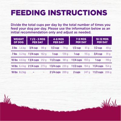 Combination Feeding: If feeding with wet food, reduce dry amount by 1/8 cup for every 6 oz of wet food.