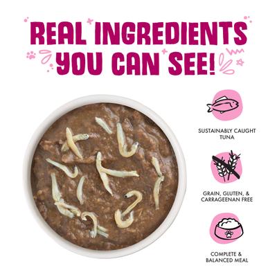 - Grain-free wet food is made with tuna and shirasu as the first ingredients so it’s high in protein sourced from real meat.