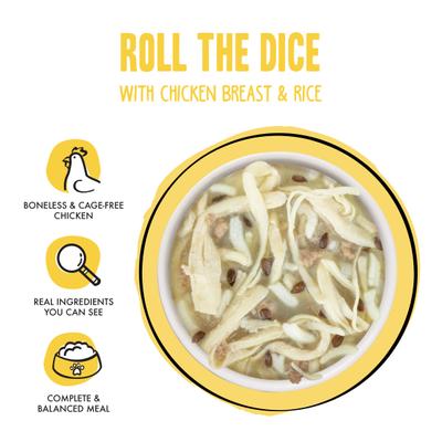 - Complete and balanced meals made with sustainably sourced, cage-free chicken and easy-to-digest rice.