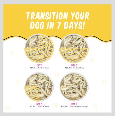 Despite how much your cat or dog asks for Weruva's high-quality foods, it's best to transition them gradually onto a new food over the course of one week. Start by mixing a small amount of Weruva in with their old food and slowly increase the proportion of Weruva over 7 days to help your pet adjust.