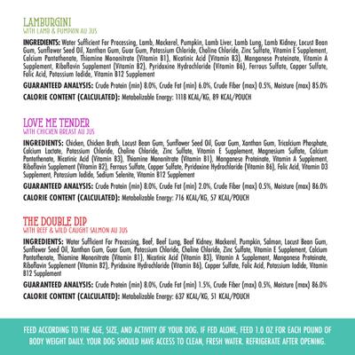 - Paw-licking palatability from real au jus is great for picky eaters, with zero grains, gluten or carrageenan.