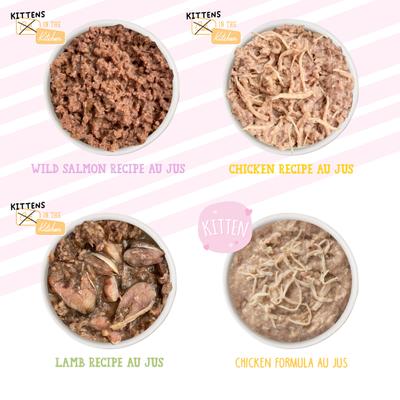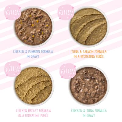 - Variety pack includes 2 each of: Chicken Formula, Chicken and Pumpkin Formula, Chicken and Tuna Formula, Tuna and Salmon Formula, Chicken Breast Formula, Lambur-kitty, Kitten Gone Wild, Kitten Frick A Zee, Chicken & Pumpkin Pawsome Purrs, Chicken Cha Cha Cha, Chicken & Salmon Cuddle Buds, Chicken Cute To Boot.