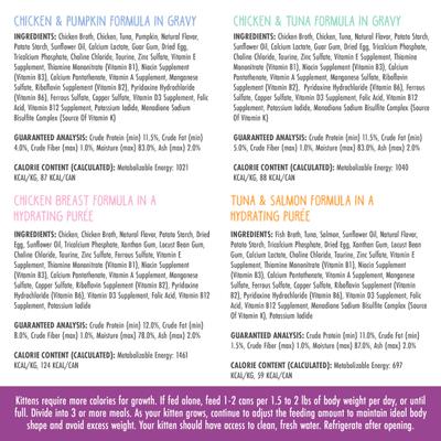 - All natural and free from gluten, carrageenan, wheat, corn, soy, artificial colors or preservatives, these hydration-focused recipes are low in carbs to help your kitten thrive.