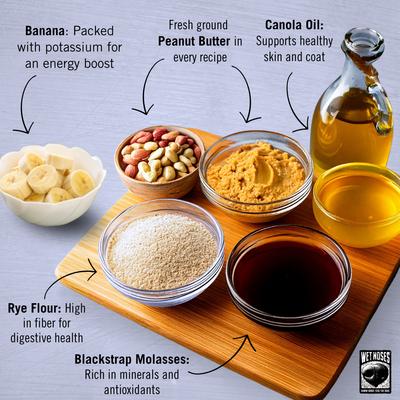 Deleita a tu amigo peludo con la mantequilla de cacahuete de Wet Noses. Golosinas crujientes para perros con sabor a plátano. Elaboradas con ingredientes aptos para consumo humano, como crema de cacahuete cremosa y plátanos de verdad, estas golosinas tienen un sabor que dejará a tu cachorro con ganas de más. Están horneadas para un sabor extra delicioso y para garantizar una textura crujiente que fomenta hábitos de masticación saludables y conserva los nutrientes esenciales. Con solo cinco ingredientes sencillos, estas golosinas no contienen maíz, trigo, soja ni aditivos artificiales, lo que las convierte en una opción saludable y nutritiva para tu mejor amigo. Esta receta también es suave para estómagos sensibles.