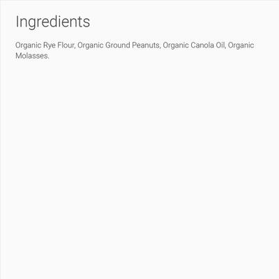 Harina de centeno orgánica, cacahuetes orgánicos molidos, aceite de canola orgánico, melaza orgánica.