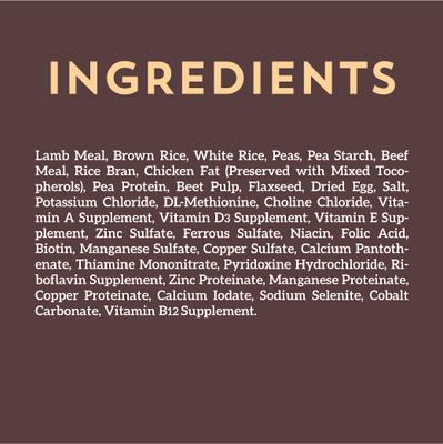 Lamb Meal, Brown Rice, White Rice, Peas, Pea Starch, Beef Meal, Rice Bran, Chicken Fat (Preserved with Mixed Tocopherols), Pea Protein, Beet Pulp, Flaxseed, Dried Egg, Salt, Potassium Chloride, DL-Methionine, Choline Chloride, Vitamin A Supplement, Vitamin D3 Supplement, Vitamin E Supplement, Zinc Sulfate, Ferrous Sulfate, Niacin, Folic Acid, Biotin, Manganese Sulfate, Copper Sulfate, Calcium Pantothenate, Thiamine Mononitrate, Pyridoxine Hydrochloride, Riboflavin Supplement, Zinc Proteinate, Manganese Proteinate, Copper Proteinate, Calcium Iodate, Sodium Selenite, Cobalt Carbonate, Vitamin B12 Supplement.
