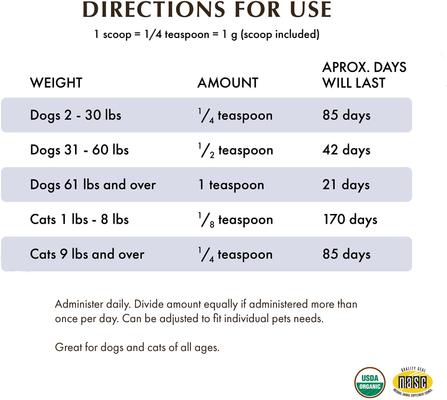 Simply mix in your pet's regular food. Daily amount may be divided amongst feedings. Amount can be adjusted according to individual pets' needs. For dogs and cats of all ages.