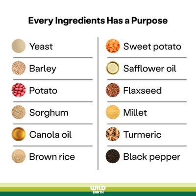 Barley, Brown Rice, Grain Sorghum, Dried Yeast, Potato Protein, Millet, Canola Oil (preserved with mixed tocopherols), Sweet Potato, Flaxseed, Dicalcium Phosphate, Calcium Carbonate, Natural Flavor (source of rotisserie flavor), Salt, Safflower Oil, Potassium Chloride, Choline Chloride, Turmeric, Taurine, L-Carnitine, Mixed Tocopherols (preservative), Zinc Sulfate, Ferrous Sulfate, Zinc Proteinate, Selenium Yeast, Vitamin E Supplement, Iron Proteinate, Manganese Sulfate, Rosemary Extract, Niacin Supplement, Copper Sulfate, Manganese Proteinate, d-Calcium Pantothenate, Copper Proteinate, Riboflavin, Thiamine Mononitrate, Vitamin A Supplement, Sodium Selenite, Pyridoxine Hydrochloride, Calcium Iodate, Folic Acid, Vitamin B12 Supplement, Vitamin D2 Supplement.
