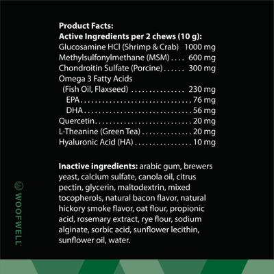 Active Ingredients: Glucosamine HCl (Shrimp & Crab), Methylsulfonylmethane (MSM), Chondroitin Sulfate (Porcine), Omega 3 Fatty Acids (Fish Oil, Flaxseed), EPA, DHA, Quercetin, L-Theanine Green Tea, Hyaluronic Acid.