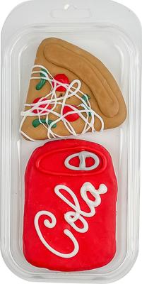 - Includes two gourmet dog cookies in fun pizza and soda can shapes.