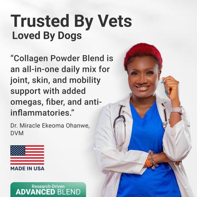 - Marine collagen peptides and beef bone broth provide multiple sources of collagen to promote healthy skin, coat shine, and joint mobility.