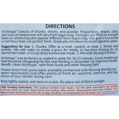 Archetype puede administrarse seco o remojado en agua durante 10 a 15 minutos. El exceso de alimento humedecido debe refrigerarse para la siguiente toma o desecharse. Para obtener el máximo beneficio para la salud, alterne Archetype con alimentos frescos y otras dietas Wysong.