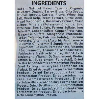 Conejo, sabor natural, taurina, arándano orgánico, orgánico Hierba de cebada, semillas de chía, brotes de brócoli, zanahorias, ciruelas, suero de leche, sal marina, algas marinas secas, extracto de levadura, ácido cítrico, tocoferoles mixtos, extracto de romero, cultivo de levadura, minerales (cloruro de potasio, proteinato de zinc, sulfato de zinc, sulfato ferroso, proteinato de hierro, sulfato de cobre, proteinato de cobre, sulfato de manganeso, proteinato de manganeso, selenito de sodio, yodato de calcio), carbonato de calcio, vitaminas (ácido ascórbico [fuente de vitamina C], suplemento de vitamina E, suplemento de niacina, pantotenato de calcio, suplemento de vitamina A, mononitrato de tiamina, clorhidrato de piridoxina, suplemento de riboflavina, suplemento de vitamina D3, biotina, suplemento de vitamina B12, ácido fólico), producto de fermentación de Bacillus licheniformis seco, producto de fermentación de Aspergillus oryzae seco, producto de fermentación de Aspergillus niger seco, Producto de fermentación de Enterococcus faecium, producto de fermentación de Lactobacillus casei seco, producto de fermentación de Lactobacillus acidophilus seco, producto de fermentación de Bacillus subtilis seco, producto de fermentación de Lactobacillus plantarum seco, producto de fermentación de Lactobacillus lactis seco.
