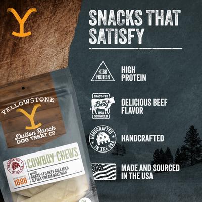 Treat your furry companion to the ultimate indulgence with Yellowstone Dutton Ranch Dog Treat Co. Cowboy Chews Long Lasting Small Natural Dog Chew Treats. These long-lasting, small, natural chew treats are a tribute to the rugged beauty of Yellowstone and the esteemed Dutton legacy. Made with certified organic, grass-fed beef, these drool-worthy snacks are a celebration of nature’s bounty and a testament to the Dutton Ranch Dog Treat Co.’s unwavering commitment to providing four-legged family members with the finest culinary experience.