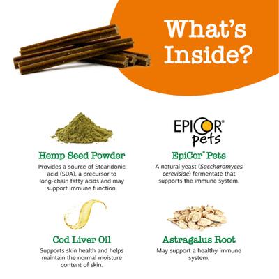 Active Ingredients: Hemp Seed Powder, Cod Liver Oil, Dried Fermentate (Made Using Saccharomyces cerevisiae) (EpiCor® Pets), Healthy Teeth & Gum Proprietary Blend (Kelp, Peppermint Oil), Turmeric, Licorice Root, Astragalus Root .Hemp Seed Powder, Cod Liver Oil, Dried Fermentate (Made Using Saccharomyces cerevisiae) (EpiCor® Pets), Healthy Teeth & Gum Proprietary Blend (Kelp, Peppermint Oil), Turmeric, Licorice Root, Astragalus Root.