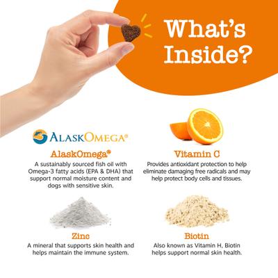 - Las vitaminas y los ácidos grasos omega de estos masticables ayudan a mantener la salud de la piel de tu mejor amigo de una manera deliciosa.