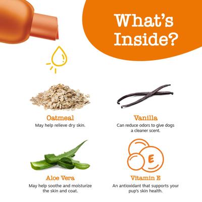 - This shampoo features oatmeal, aloe vera, vitamin E, and a blend of gentle ingredients to support your furbaby’s skin and coat health.