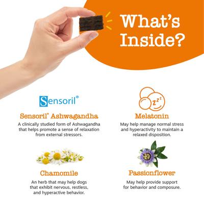 - Si el comportamiento de tu mejor amigo implica ladrar, morder, saltar e hiperactividad, estos deliciosos Los masticables pueden promover la compostura para ayudarlos a mantenerse tranquilos y callados. Son perfectos para momentos estresantes normales como tormentas eléctricas, fuegos artificiales, viajes en auto, viajes, parques o ansiedad por separación. A tu mejor amigo le encantará el delicioso sabor a pollo ahumado de estos bocados masticables, y a ti te encantarán los beneficios que le brindan a tu peludo. Estos masticables sin granos son perfectos para cachorros con comportamientos nerviosos, tensos, ansiosos o agresivos, y promueven una sensación de calma y comodidad. Los masticables contienen una forma altamente bioactiva de ashwagandha para favorecer la concentración, la claridad y la relajación frente a los factores estresantes externos. Si el comportamiento de tu mejor amigo implica muchos ladridos, mordiscos, saltos e hiperactividad, estos sabrosos masticables pueden promover la compostura. Ayudan a mantenerlos tranquilos y silenciosos.