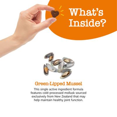 - These chews feature cold-processed New Zealand green lipped mussel.