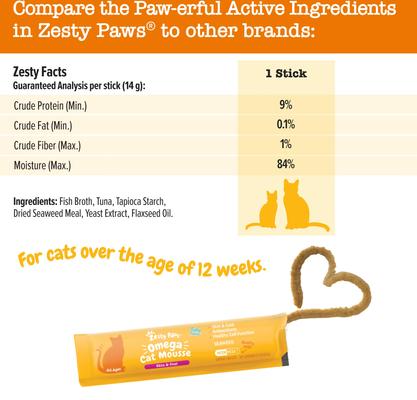The Zesty Paws Omega Skin & Coat Tuna Mousse Lickable Squeeze Supplement for Cats is a su-purr tasty way to support your furbaby’s skin and coat health. Seaweed provides omega-3 and omega-6 fatty acids, plus antioxidants, vitamins, and minerals for a healthy coat and skin to help keep your kitty looking and feeling paw-some. That goodness is paired with tuna, fish broth, and flaxseed oil for delicious taste. Serve the mousse up as a meal topper for yummy mealtimes, or give it to your best friend as a treat.