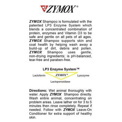 Elimina los problemas de la piel de tu mascota con el champú enzimático para perros y gatos Zymox. Gracias al poder curativo de las enzimas, proteínas naturales, este champú es muy eficaz contra infecciones bacterianas, fúngicas y por levaduras, así como contra la picazón causada por alergias. Actúa destruyendo los organismos dañinos y creando una barrera protectora gracias a la mayor potencia del sistema enzimático LP3, de eficacia probada, y a la vitamina D3, que también hidrata la piel. Las enzimas tienen propiedades antiinflamatorias que calman y suavizan la piel. Y con solo los surfactantes vegetales más suaves y sin ingredientes agresivos, es lo suficientemente suave incluso para cachorros y gatitos, con una fragancia agradable y suave.