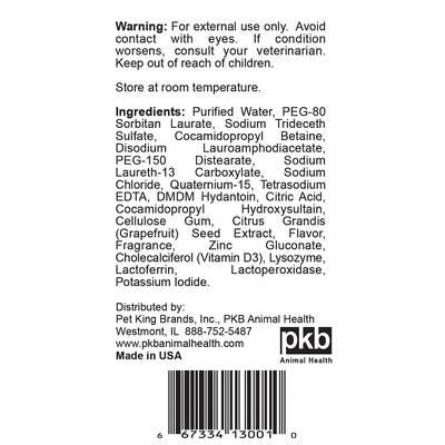 Agua purificada, PEG-80 Laurato de sorbitán, trideceth sulfato de sodio, cocamidopropil betaína, lauroanfodiacetato disódico, diestearato de PEG-150, lauril éter 13 carboxilato de sodio, cloruro de sodio, cuaternio-15, EDTA tetrasódico, DMDM hidantoína, ácido cítrico, cocamidopropil hidroxisultaína, goma de celulosa, extracto de semilla de Citrus grandis (pomelo), saborizante, fragancia, gluconato de zinc, colecalciferol (vitamina D3), lisozima, lactoferrina, lactoperoxidasa, yoduro de potasio.