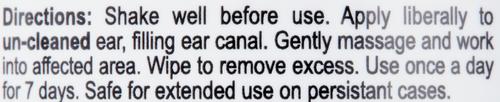 Shake well before use. Apply liberally to un-cleaned ear, filling ear canal. Gently massage and work into infected area. Wipe to remove excess. Use once a day for 7 days. Safe for extended use on persistent cases.